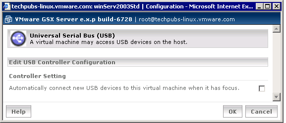 The USB controller is disabled by default in all virtual machines created with GSX Server. If you want to add a USB controller to the virtual machine's configuration, complete the following steps with the virtual machine powered off. You can add the device from the console or from the management interface.