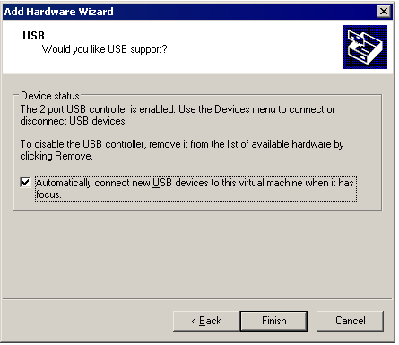 5. Click Finish to install the virtual USB controller, then click OK to save the configuration and close the virtual machine settings editor.