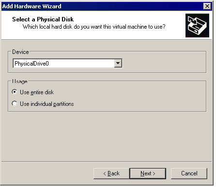 4. Choose the physical hard disk to use from the drop-down list. Then select whether you want to use the entire disk or use only individual partitions on the disk. Do one of the following: