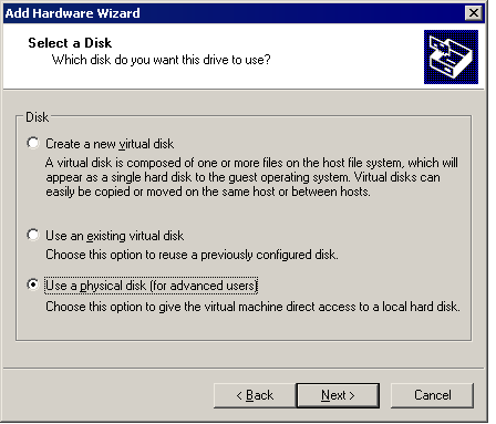 3. Select Use a physical disk, then click Next. The Select a Physical Disk screen appears.