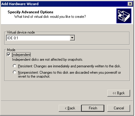 Click Advanced if you want to specify the virtual machine SCSI or IDE device node to which this disk is connected.