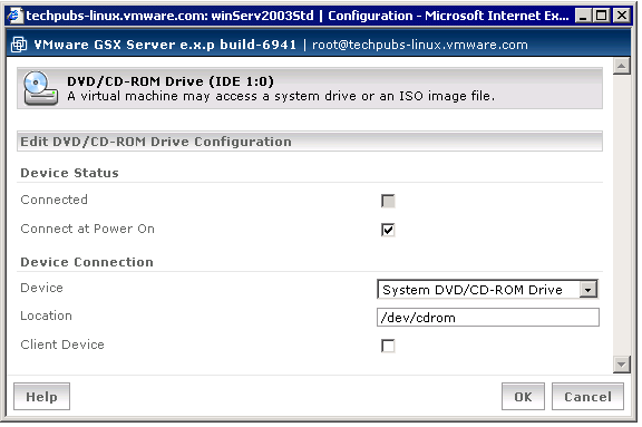 Options you can configure include choosing the device node for the guest, using legacy emulation mode, using the optical drive on a client instead of the GSX Server host and exclusively using the DVD-ROM or CD-ROM drive.