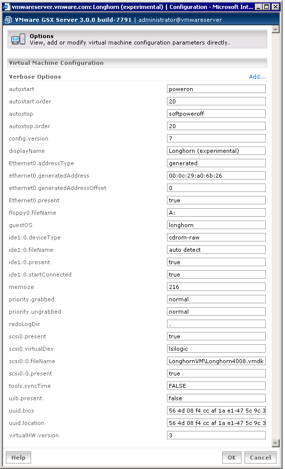 If you need to add or change a virtual machine's configuration option that cannot be accessed from elsewhere in the management interface, you can edit the virtual machine's configuration file (.vmx) from the Options tab.