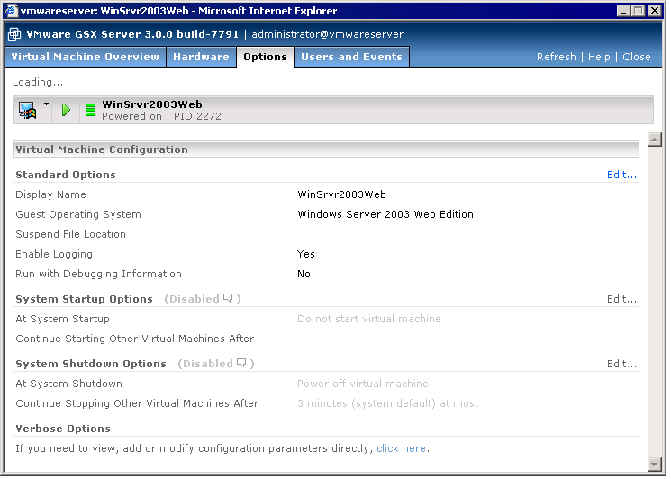 To review and modify basic information about a virtual machine, or to access the configuration file directly, click the Options tab. The Options page appears.