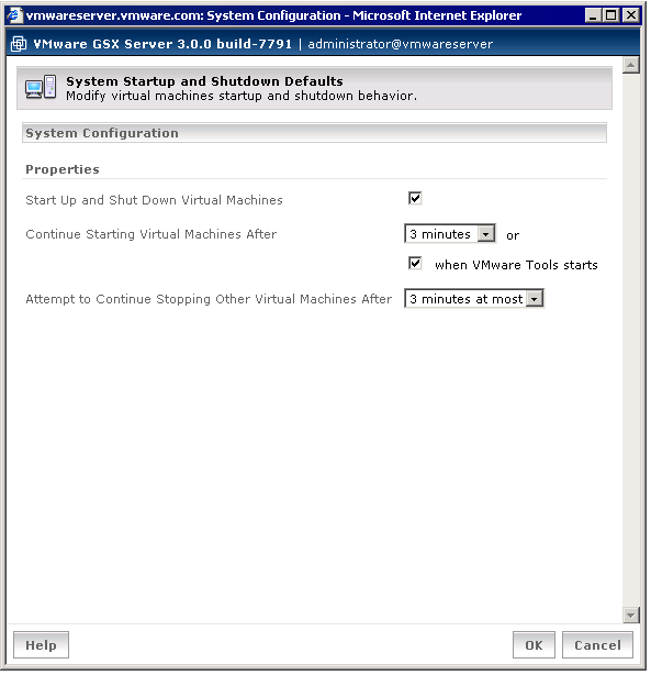 To specify a period of time before the next virtual machine starts, in the Continue Starting Virtual Machines After list, either choose the number of minutes to wait or indicate that GSX Server should not wait before starting the next virtual machine. If you select Other, specify the number of minutes to wait in the prompt that appears. It is a good idea to set a delay between starting virtual machines, as a delay avoids placing an undue burden on the host processors and memory.