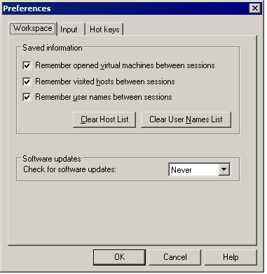The Preferences dialog box allows you to change a number of settings that apply to all virtual machines running in a console. These settings apply to the user currently logged on to the host computer. The settings do not affect settings made by any other user when that user is logged in to the host. These settings can be changed by regular users, as well as root and Administrator users.