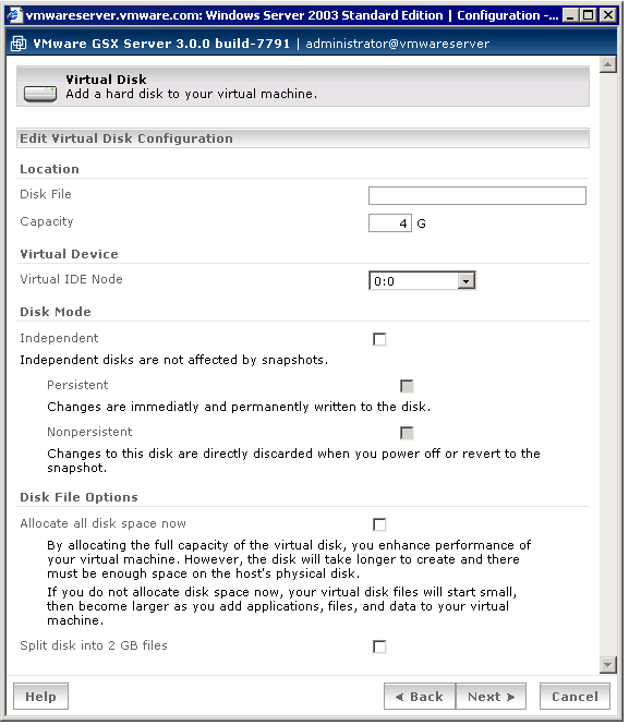 3. In the Capacity field, specify the size of the virtual disk in Gigabytes (GB). By default, GSX Server preallocates the space for the virtual disk when you create it.