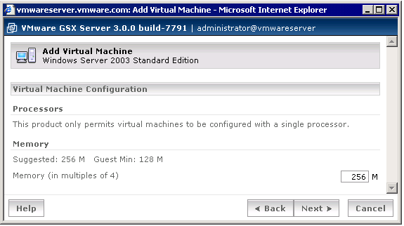 3. Allocate memory to the virtual machine. The default setting in the Memory field depends on the guest operating system you have selected. You may need to change it to meet the demands of applications you plan to run in the virtual machine. The amount of memory you specify must be a multiple of four. You may change this setting later.