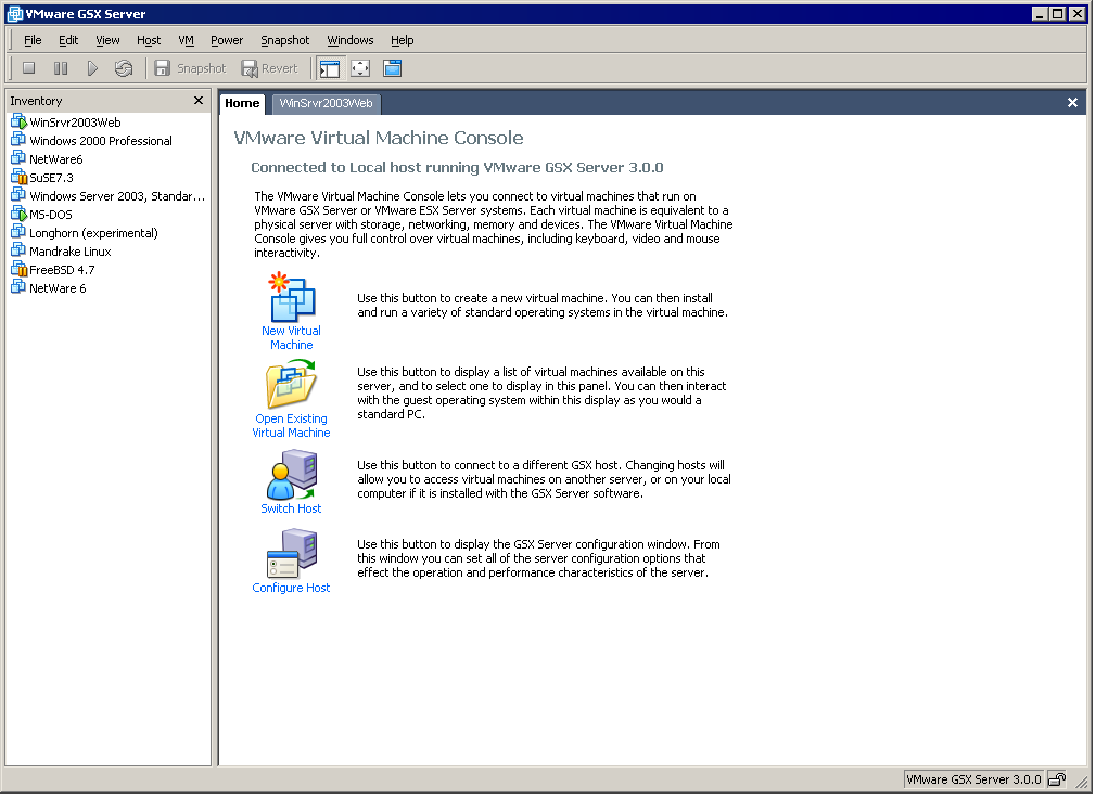 When you first connect a console to a GSX Server host, the Home tab appears in the virtual machine display. The Home tab indicates whether you are connecting to a GSX Server or ESX Server system, and the version of the server software. The status bar of the console window also displays this information.