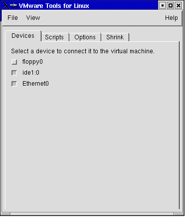 The Devices tab allows you to enable or disable removable devices. Removable devices include the floppy and CD-ROM drives and the virtual network adapter.