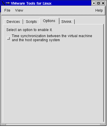 The Options tab gives you the option to synchronize the time in the guest operating system with the time in the host operating system.
