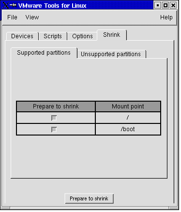 To shrink virtual disks, you should run VMware Tools as the root user (su -). This way, you ensure the whole virtual disk is shrunk. Otherwise, if you shrink the virtual disk as a non-root user, you cannot prepare to shrink the parts of the virtual disk that require root-level permissions.