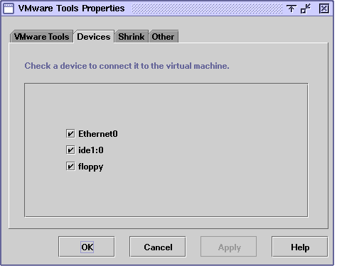 The Devices tab allows you to enable or disable removable devices. Removable devices include the floppy and CD-ROM drives and the virtual network adapter.
