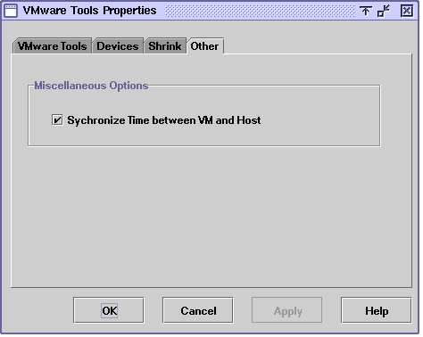 The Other tab gives you the option to synchronize the time in the guest operating system with the time in the host operating system.