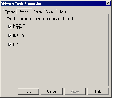 The Devices tab allows you to enable or disable removable devices. Removable devices include the floppy and CD-ROM drives and the virtual network adapter.