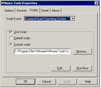 A default script for each power state is included in VMware Tools. These scripts are located in the guest operating system in C:\Program Files\VMware.