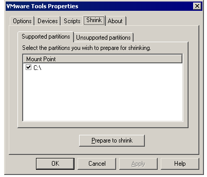 The Shrink tab gives you access to the controls you need if you wish to reclaim unused space in a virtual disk.