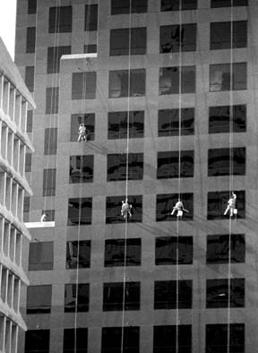Washing windows of a downtown building.