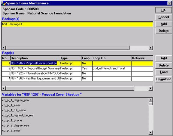 Coeus prints proposal data on specific sponsor forms. Coeus uses postscript forms and Powerbuilder datawindows for printing. Supported forms for each sponsor should be loaded into the Coeus database. Sponsor forms are stored in the database with the associated sponsor. Forms are organized as packages. One sponsor can have multiple packages and each package can have multiple pages. Each of these pages can either be a post script file or a Powerbulder datawindow syntax. Page type (postscript or datawindow) is transparent to the user printing the proposal, you need to specify this only when you load the form in to the database.