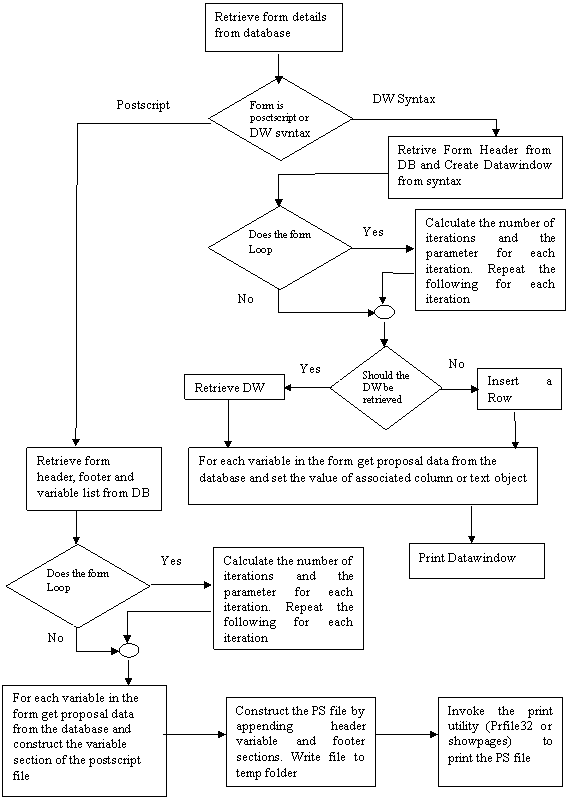 Forms can be created either as postscript files using the Draw.exe program or as PowerBuilder datawindow syntax. You should create a datawindow syntax only if the form is simple and easy to create as a Powerbuilder datawindow and the data in the form can be retrieved from the database with a single retrieve. All complex forms with data items from many different tables should be created using the draw program.