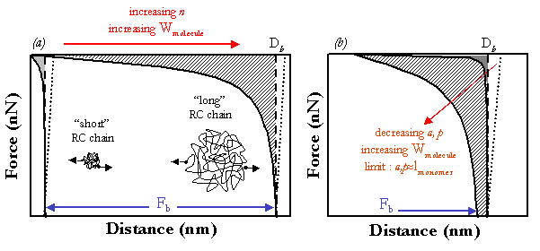 The increase in Wmolecule and shape of the force versus distance curve