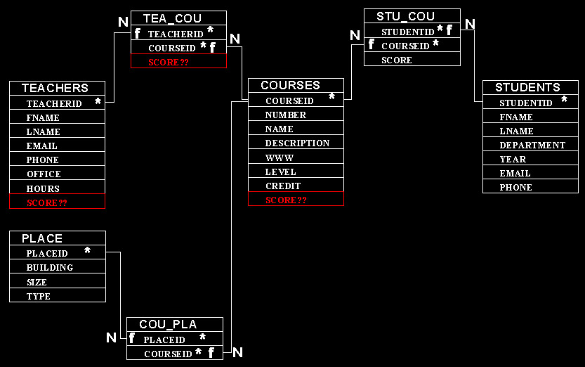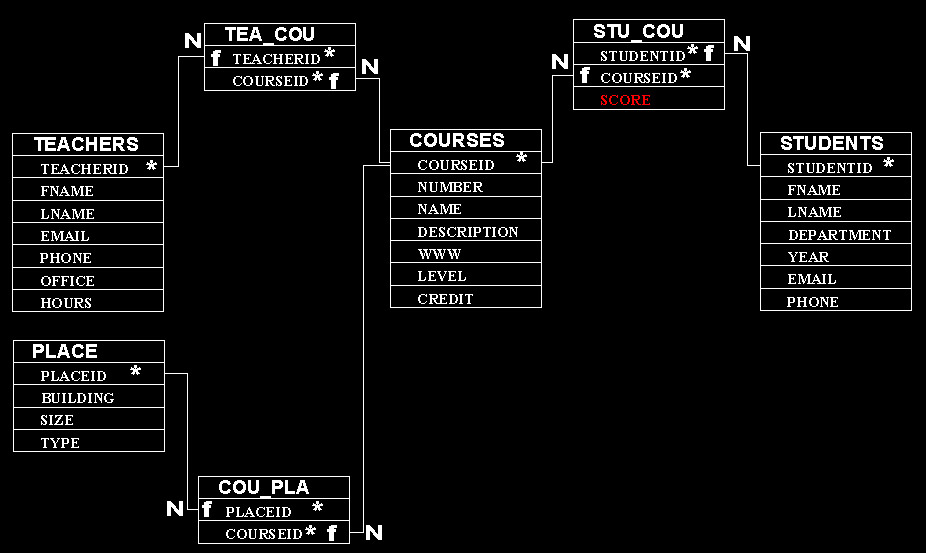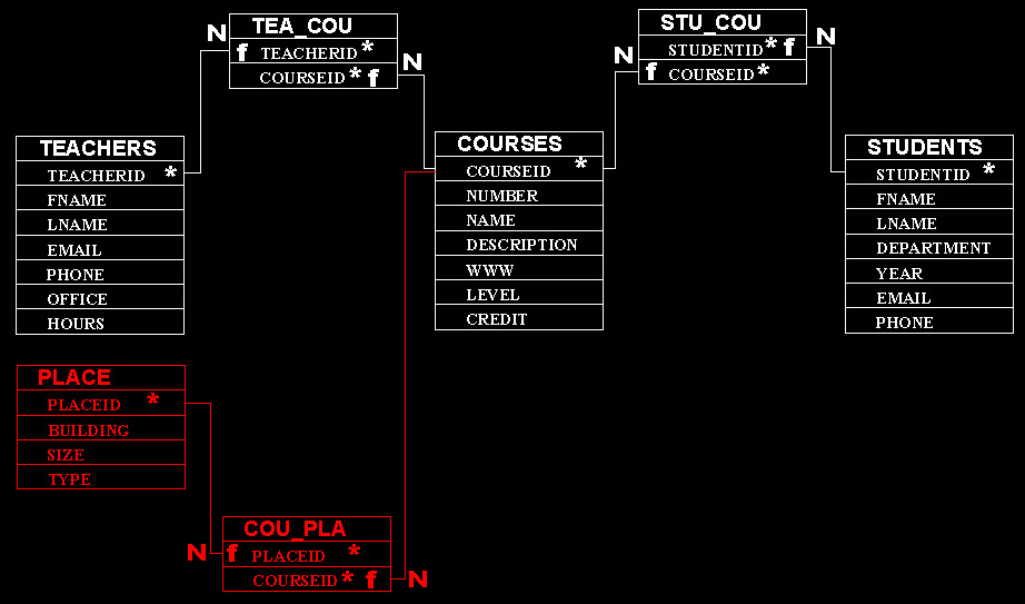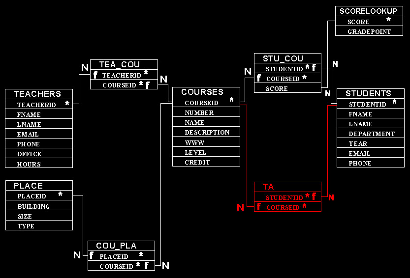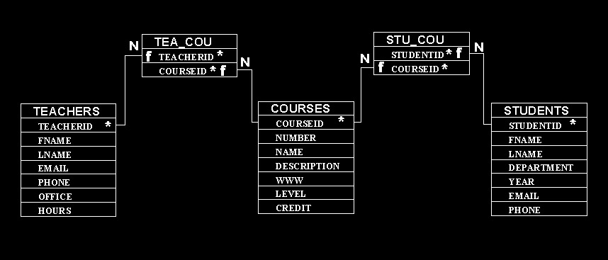 Courses: ID, CoureNumber, Name, Desription, WWW, Level, Credit...