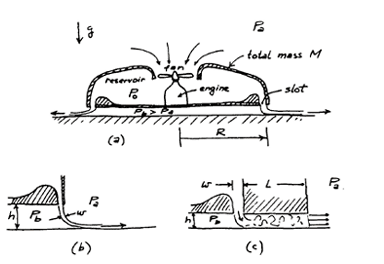 The sketch (a) shows the cross-section of an air cushion vehicle of the "peripheral jet" type, first developed by Christopher Cockerell in the mid-1950s. A fan draws air from the ambient atmosphere at pressure pa and compresses it to a stagnation pressure po in the reservoir inside the vehicle. The air then exhausts downward through a narrow slot of width w at the periphery of the vehicle (w<<R), creating a condition that maintains a positive gage pressure (an "air cushion") underneath the vehicle. This allows the vehicle to float at a height h above the ground. This problem is concerned with the mechanics of how the "air cushion" is maintained the vehicle holds itself off the ground. In what follows we assume that the vehicle has total mass M and is circular with outer radius R, the slot has a width w that is very small compared with R, the jet issues vertically downward from the slot as shown, and the vehicle's elevation h is always small compared with R. A fan or turbine maintains the pressure in the reservoir at pressure D p0 = p a + D p. In what follows, we proceed with the assumption that the flow from the reservoir to the slot is steady, incompressible and inviscid. To simplify matters, we shall also assume (tentatively) that the pressure pb under the vehicle is just slightly greater than pa, such that pb - p 0 << D p. and justify this à posteriori by showing that our solution is consistent with is assumption. Given: r, M, g, R, w, D p, where w<<R, h<<R |