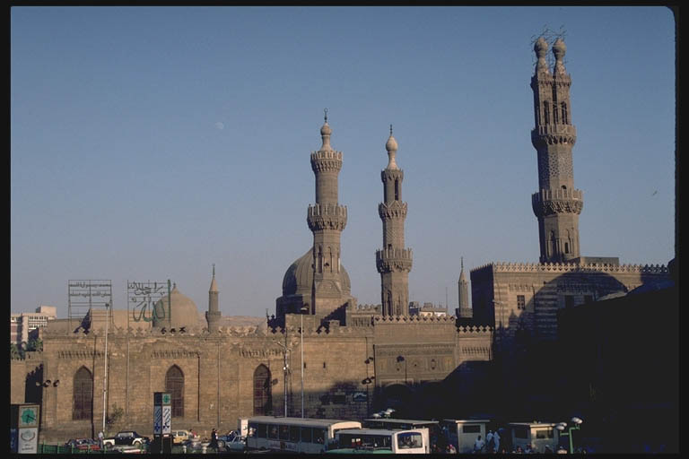 View of the main facade of the mosque with, from left to right, the minarets of the madrasa al-Aqbughawiyya, of Qaytbay, and of al-Ghuri.