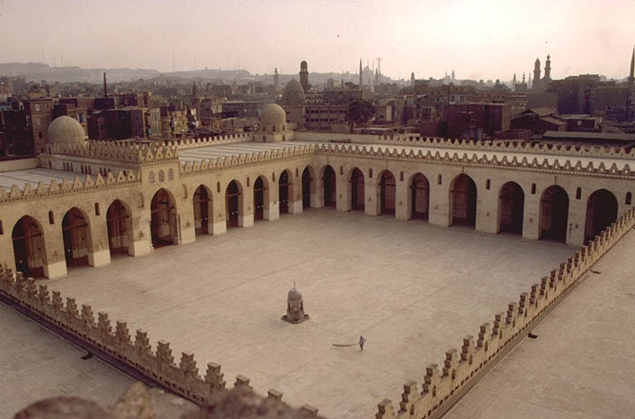 A general view of the courtyard showing the mihrab dome and one of the two side domes.
