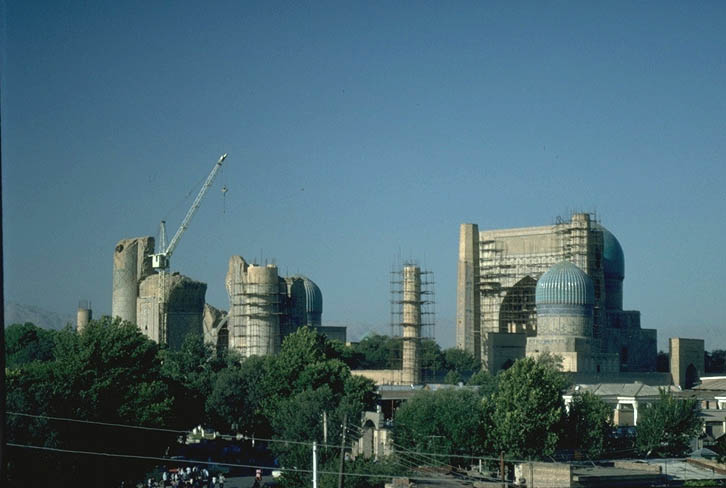 General view of the Bibi-Khanum Mosque as it stood in 1995 with the halt of the Soviet large-scale restoration project.