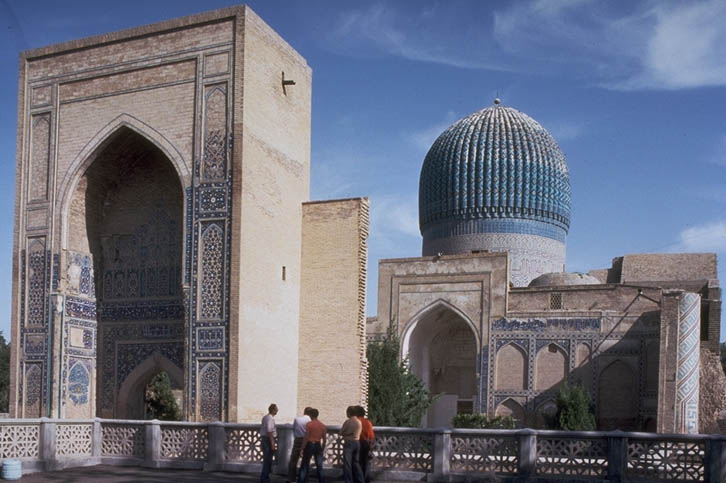 General view of the mausoleum with its tiled portal and massive ribbed and tiled dom.
