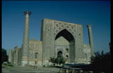| The Madrasa of Ulugh Beg in Samarqand (1417-20): standing in front of the Registan square, this four-iwan madrasa has four domed chambers on the corners, possibly functioning as mausolea, and a vaulted prayer hall on the iwan axis. The Registan square was defined later by the addition of two other madrasas to form a locus of urban life. |