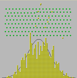 The exhibit below illustrates a more simple process that gives rise to the familiar "bell curve" of the normal distribution. In this case balls are dropped from the top and pass through a series of pins until they hit the bottom. Once at the bottom, they stack up to record the number that have hit that point. At first there does not seem to be any pattern but after a few minutes the stacks conform to the superimposed curve.