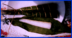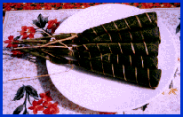 ちまきは本来、きな粉や黒蜜で食しましたが、その後砂糖を加えて甘くしたも のが作られるようになりました。この写真は、京都発祥の道喜(どうき)ちまき のものです。この形のものが、比較的、一般に広まっているようです。