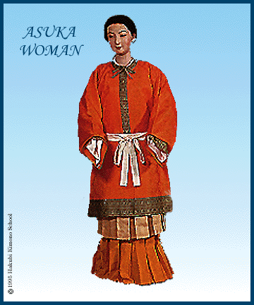 During the Asuka and Nara periods sewing methods developed more, and clothing became longer and wider. Courtier's clothes were divded into three groups: formal clothes, court clothes and uniforms, the colors varying with rank.