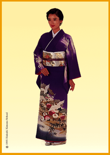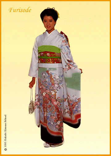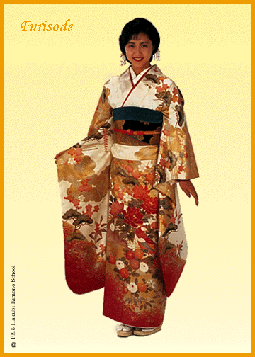 The sleeves of the kimono indicate the age and marital status of a woman. A young unmarried woman would wear a furisode, a colorful kimono with flowing sleeves that hang almost to the ankles. The Furisode, made of of chirimen and decorated by yuuzen, is appropriate to wear on formal and ceremonial occasions, such as weddings.