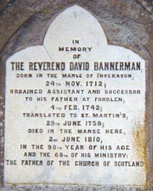 | David BANNERMAN (1712-1810) | In / memory / of / the Reverend David Bannerman, / born in the manse of Inveravon, / 24th Nov. 1712, / ordained