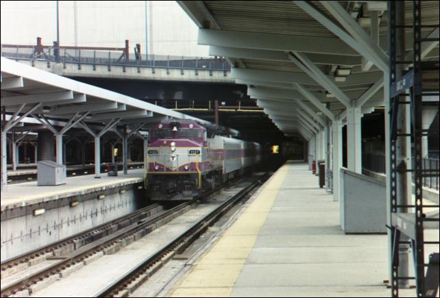 Description : North Station is immediately beneath the Fleet Center. The commuter rail waits to leave, with the rearmost cars hiding beneath the building and the Leverett Circle Connector ramp.