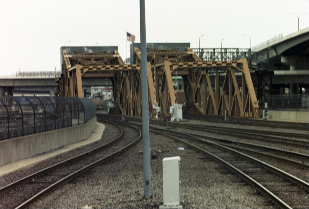 There are four tracks of drawbridge immediately north of North Station. The signal on the leftmost track indicates the the train is clear to cross the bridge.