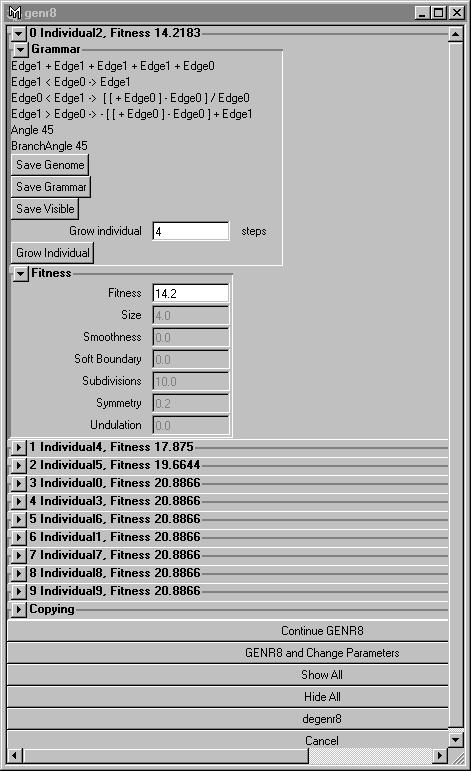 Continue with the same genetic material as in your last run. The genome is read from the file genome.txt. In this way, you can change your settings and parameters after running a few generations. |