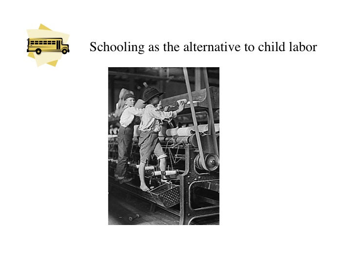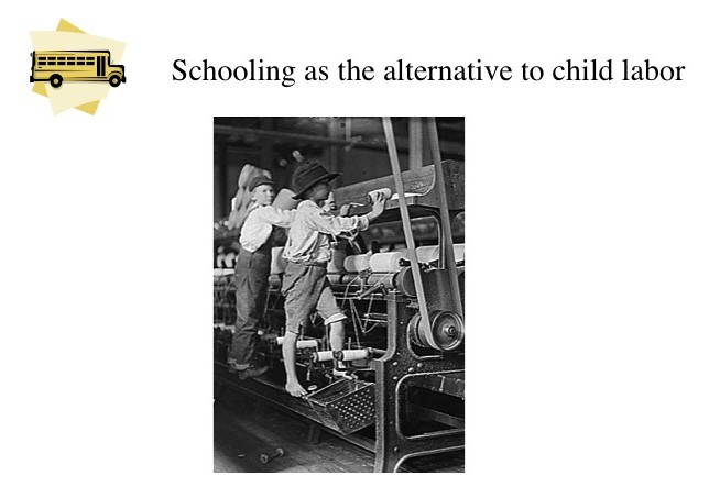 With industrialization and the accompanying move from the farms to the factories, the dramatic increase in demand for workers led to the use of child labor in factories. To counteract the utilization of a child labor force, public education was proposed as the solution to get children out of the factories. This movement turned into a broader initiative to provide everyone with the opportunity to obtain an education and a means to socioeconomic advancement.