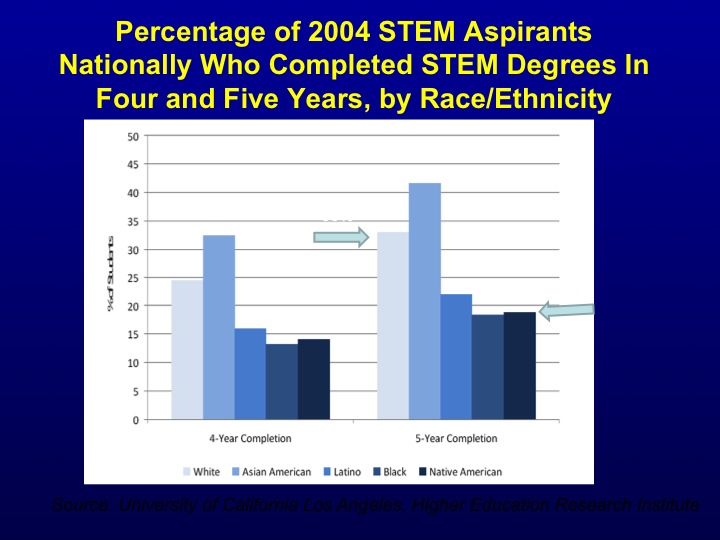 In order to meet this dramatic demand for STEM individuals, the PCAST working group first investigated students currently majoring in STEM fields. The working group found that fewer than 40% of students who start college intending to major in a STEM field actually major in a STEM field. This statistic is even more dramatic when examining minority students as fewer than 20% of some ethnic groups stay in STEM fields (see Figure 1). By increasing the retention rate from just 40% to 50%, the goal of educating 1 million more students in STEM fields will be met. In addition to economic reasons, there are other reasons for changing education in STEM fields. Graduating STEM students entering the job market substantially lack conceptual and analytical thinking and exhibit poor knowledge retention; some estimates indicate that students only retain about 10-20% of a course’s content. The retention rate needs to increase in order to meet the job market demands. As a result, this issue of STEM student retention is of the utmost importance.