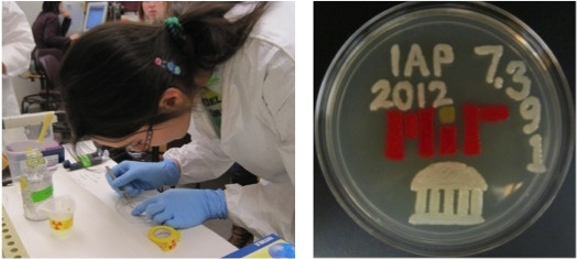 Left: MIT 7.391 student preparing a bacteriophage sample for EM. Right: Students in the 7.391 Lab Course drew "MIT" with colorful bacteria strains they isolated from the Charles River in Boston.