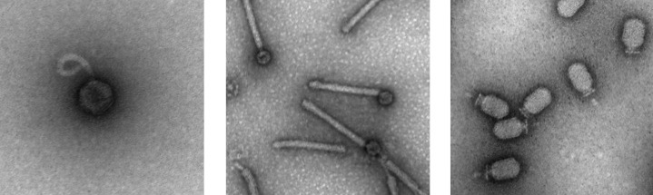 Electron microscope images of various bacteriaphages isolated from the Charles River, Boston by students in the MIT course 7.391.