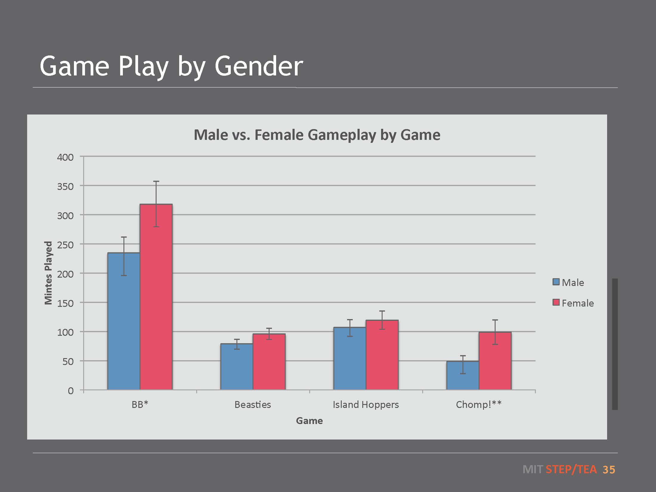 The first category of learning games that he described was UbiqGames (ubiquitous games). UbiqGames work on mobile devices and are designed specifically for frequent use over short periods of time. One such UbiqGame is the UbiqBio Project, an NIH-funded research study to develop four standards-based, biology learning UbiqGames. The four games focus on genetics, ecology, and evolution concepts and are called Beetle Breeders, Invasion of the Beasties, Island Hoppers and Chomp!. The UbiqBio games not only have student portals, but also have an instructor portal to enable teachers to observe student play and progress and a researcher portal to collect data on student use and progress. Professor Klopfer was able to dispel a common myth that males play more games than females. The data on student use show that female students played all four of the games for more minutes than males. In a research study to assess the effectiveness of the UbiqBio games on student learning of biology concepts, Prof. Klopfer found that students who played the games had increased learning gains in Genetics compared to students who had not played with the games.