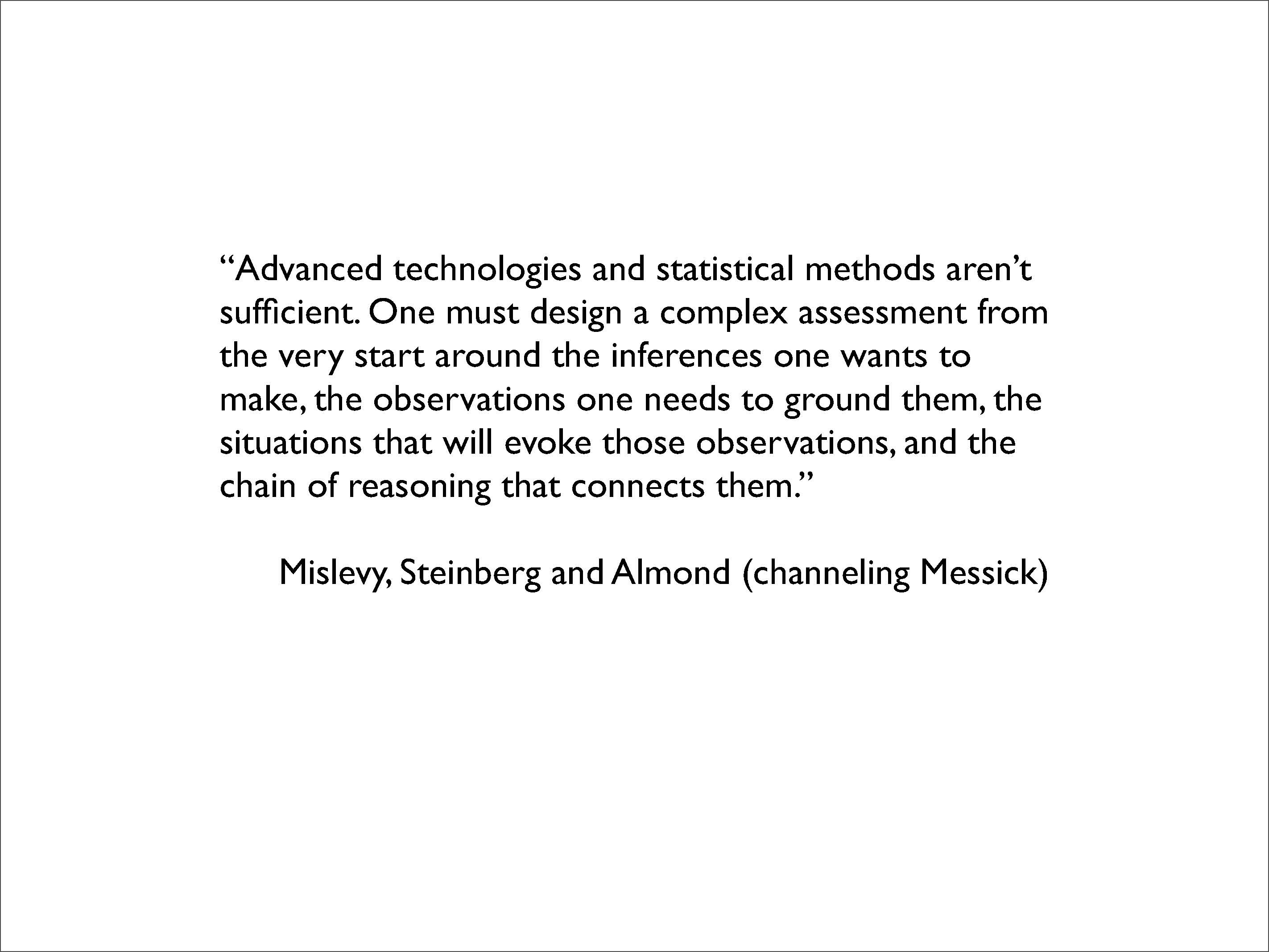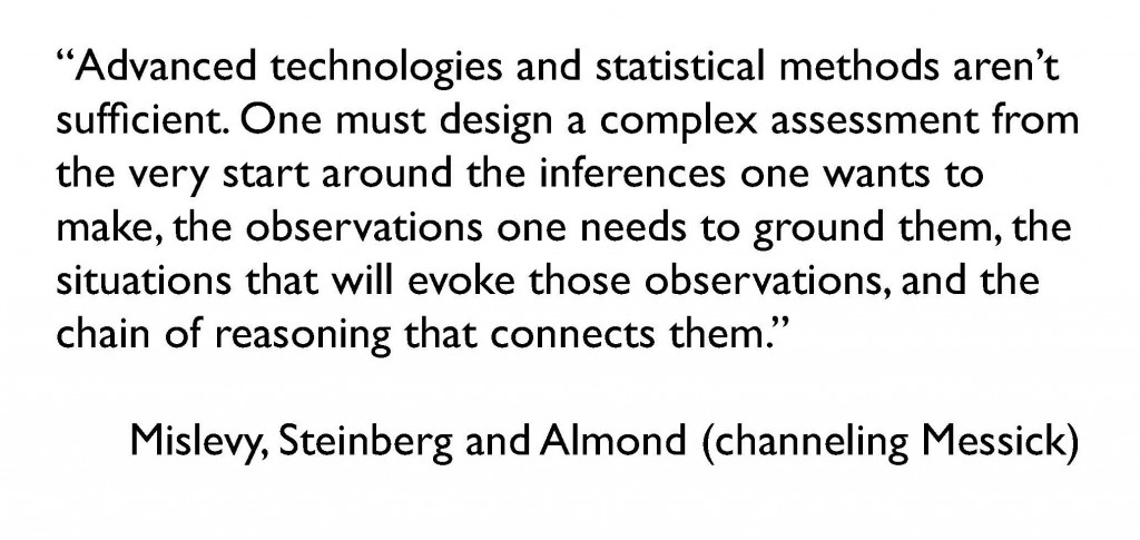 Dr. Bergner started his group meeting by giving a brief overview of psychometrics as quantitative measurements of psychological phenomena that is informed by many fields, including statistics, psychology, psychophysics, cognitive science and computer science. A major component of psychometrics is the development of accurate and valid testing strategies, with educational testing being the focus of Dr. Bergner’s talk. Dr. Bergner referred to Evidence Centered Design (Mislevy, Steinberg and Almond, 2003) as a guiding principle for education researchers to think from the beginning about the desired inferences when framing the assessment and analysis strategy.
