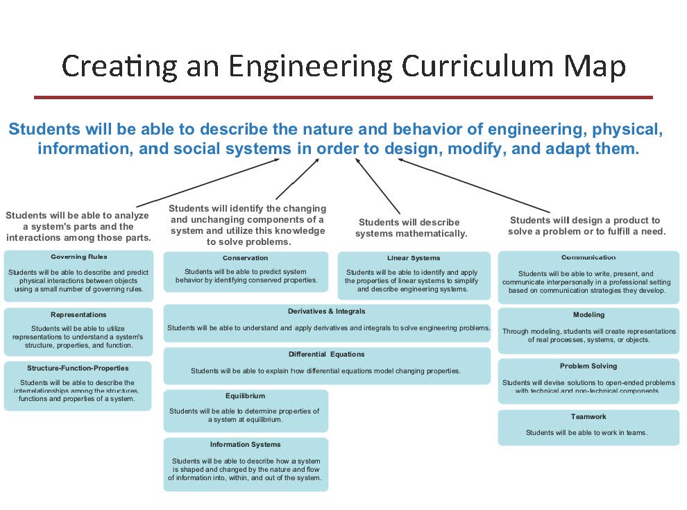 Before the videos themselves could be developed and produced, Dr. French and the TLL team assessed the engineering curriculum as a whole to determine the most important concepts around which the videos would be developed. In the design phase of this project, the team set out to achieve three goals to: 1) establish the main goals of the SUTD curricula, 2) identify pivotal concepts in the first 3 semesters of course material, and 3) determine how and why the concepts are pivotal to the curriculum. Using research literature on pre-existing course materials at MIT and other institutions as well as on common misconceptions as references, Dr. French and the development team identified pivotal concepts and prioritized the content to identify concepts that were interdisciplinary in nature and most likely of relevance for future engineering courses. They then created a concept map for the engineering curriculum. Through this process, they identified the big idea in engineering to be that “students will be able to describe the nature and behavior or engineering, physical, information, and social systems in order to design, modify and adapt them.” The entire concept map illustrates the main knowledge and skill concepts as well as the desired learning outcomes for each of the concepts in the entire engineering curriculum (Figure 1).