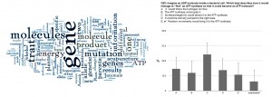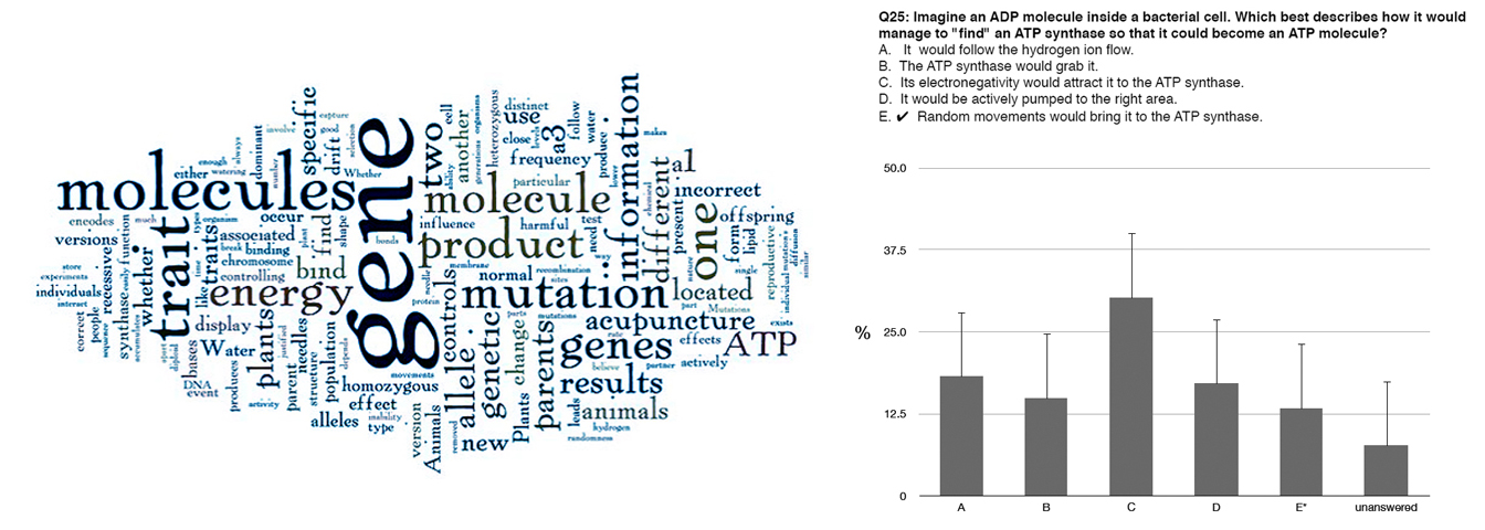 Left: The BCi word cloud. Right: A histogram showing student responses to a question in the BCi about randomness in biological processes. Click to view larger images.