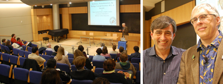 Left: Professor Mike Klymkowsky delivers a stirring seminar at MIT on April 22, 2011. Right: Professor Eric Mazur (Harvard University), in attendance at the seminar, with Professor Klymkowsky before his talk.