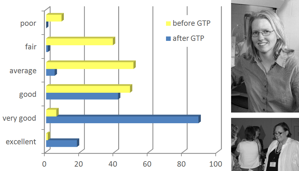 Left: Results from an exit survey administered to 155 students who participated in the GTP's "Certificate in College Teaching" program. Students were asked to rate their teaching skills before and after completing the program. Upper Right: HHMI Investigator Professor Kristi Anseth, who participated in the GTP's Lead Network during her graduate studies at the University of Colorado. Lower Right: Dr. Laura Border at the 2011 "Best Should Teach" awards. Click to view larger images.